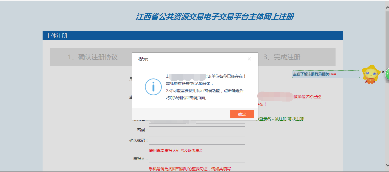 如果提示“該單位名稱已經(jīng)存在!”,證明單位已經(jīng)注冊過,無需再次注冊,按提示引導(dǎo)找回賬號密碼即可;