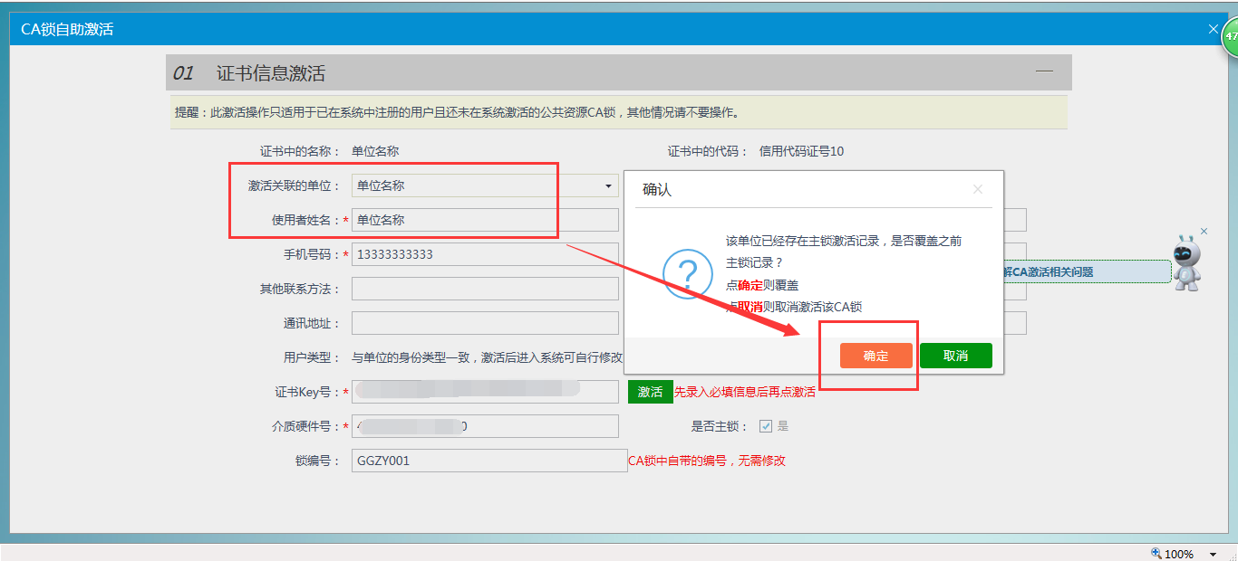 2)按照正常CA鎖激活順序,激活新辦CA主鎖,系統(tǒng)會(huì)提示“該單位已經(jīng)存在CA主鎖激活記錄,是否激活?”