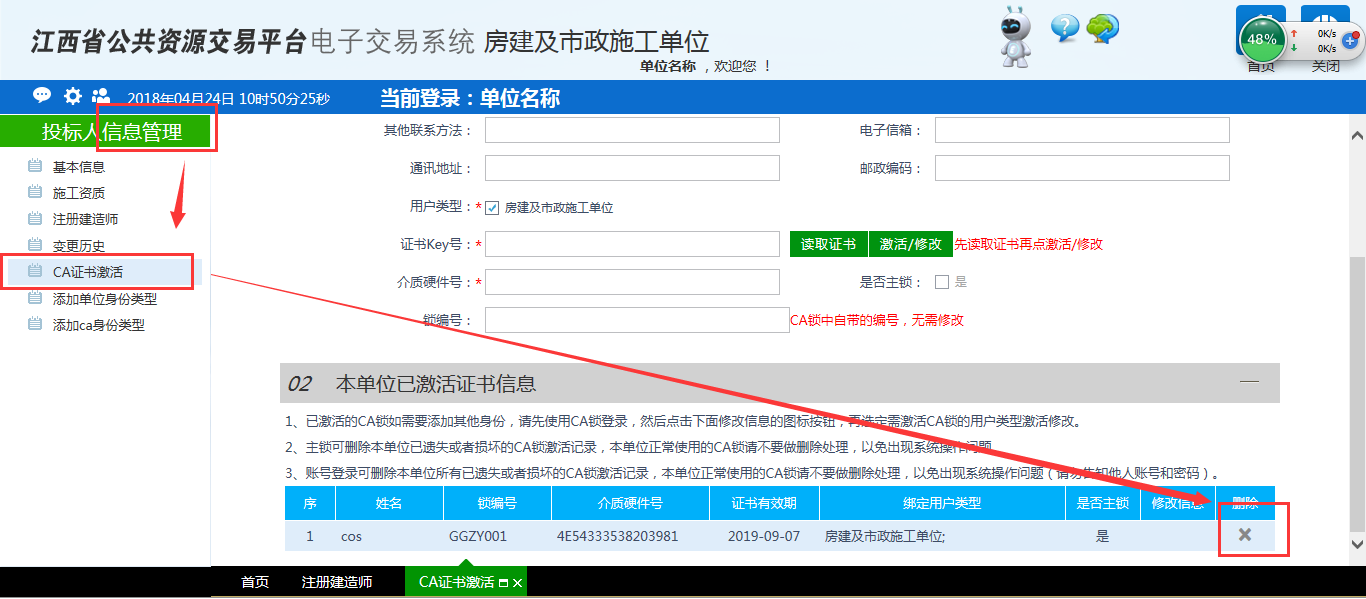 1)使用賬號(hào)登錄系統(tǒng)后,點(diǎn)擊“信息管理”菜單下的“CA證書(shū)激活”模塊(每個(gè)單位類型下都有該模塊),找到原先主鎖激活記錄,點(diǎn)擊“×”按鈕(此方法適合能使用賬號(hào)登錄系統(tǒng)的用戶,若不記得賬號(hào)可使用第一種方法);