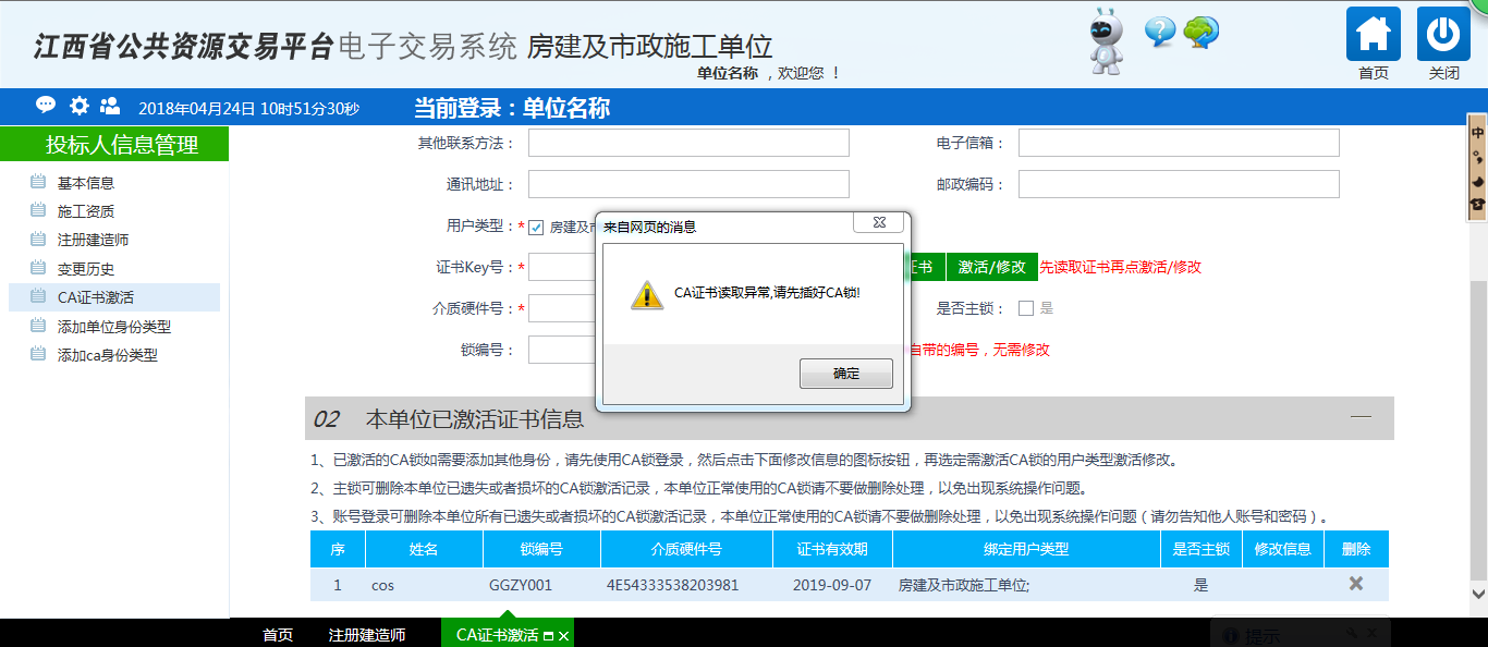 注意:這時(shí)候需要插上新辦的CA主鎖,否則系統(tǒng)會(huì)提示“CA讀取異常,請(qǐng)插好CA鎖”