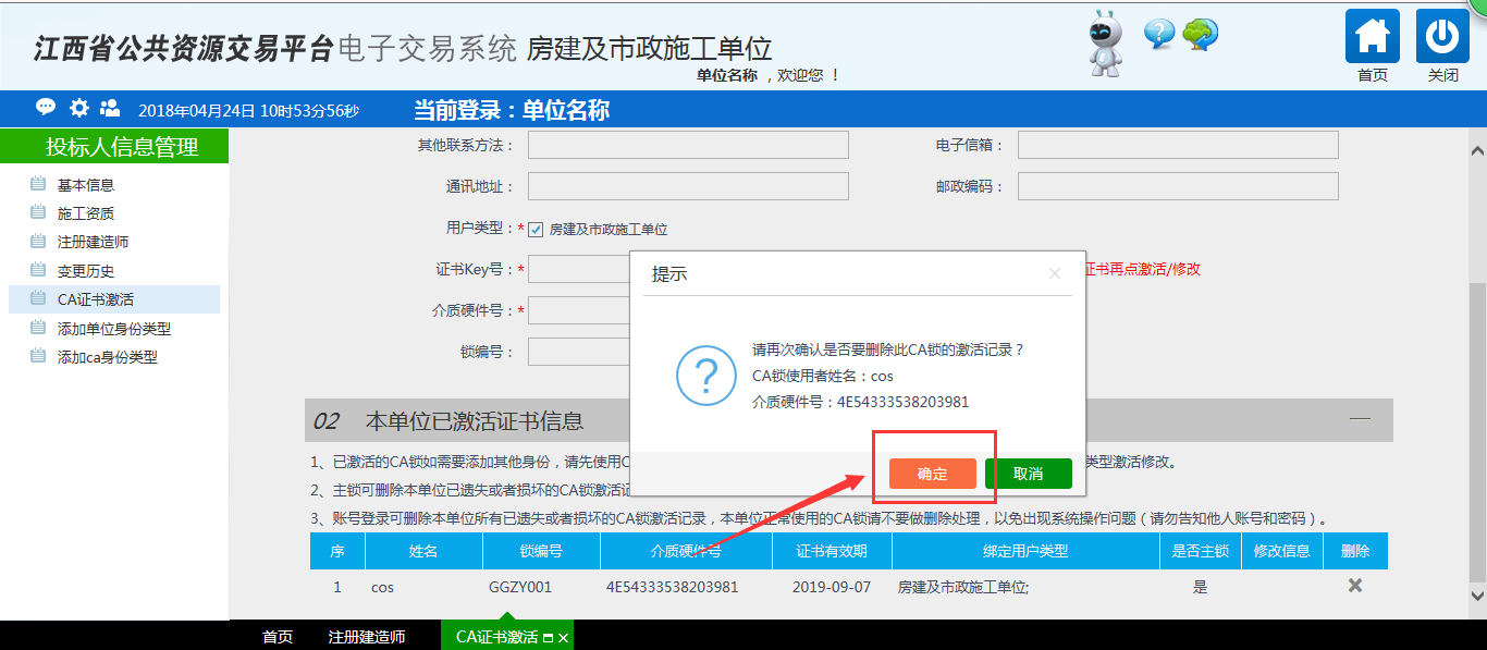 2)插好新辦CA鎖,點(diǎn)擊確定后,重新點(diǎn)擊“×”按鈕,系統(tǒng)會(huì)提示確認(rèn)要?jiǎng)h除的CA主鎖信息,確認(rèn)后點(diǎn)擊“確定”按鈕,即可將原先主鎖激活記錄刪除;這時(shí)候就可以按照正常的CA鎖激活順序激活新辦CA主鎖了。