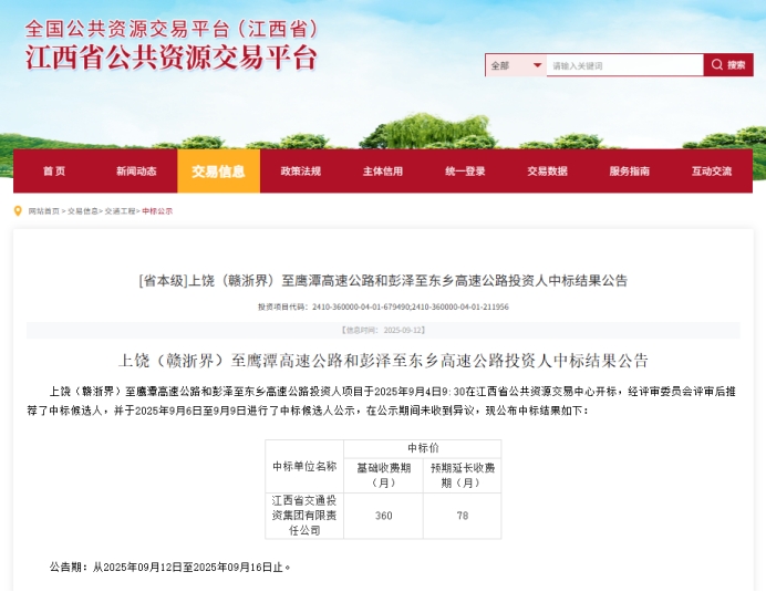 近日,上饒(贛浙界)至鷹潭高速公路和彭澤至東鄉高速公路投資人項目招標工作在江西省公共資源交易集團(江西省公共資源交易中心)(以下簡稱“省交易集團”)順利完成。此次招標工作的圓滿完成,是省交易集團繼“G7021寧武高速新干至瑞昌(贛鄂界)段及新干至興國高速公路新建工程特許經營項目投資人”項目后服務全省重大基礎設施建設項目、助力交通強省戰略落地實施的又一重要成果。
